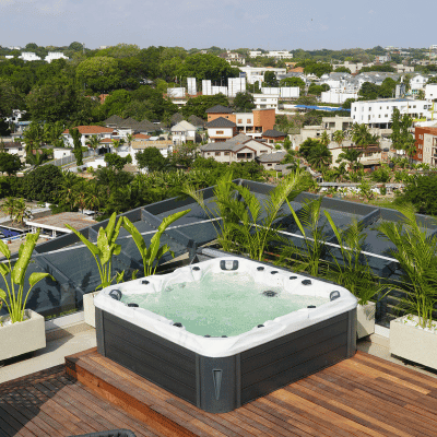 Four pools, landscaped decks, outdoor cinema.